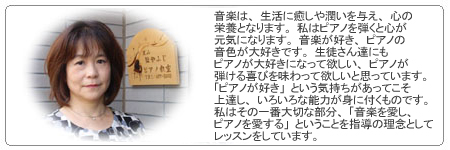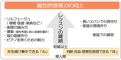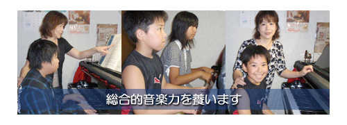当教室では、必要に応じて「曲からイメージする絵を描くこと」や「連弾」、「小打楽器とのアンサンブル」なども行い、多くの生徒さんに「音楽の楽しさ」を味わってほしいと思っています。また、レッスンを通して、自主性・計画性を培い、創造力やコミュニケーション能力などの育成も図っていきます。